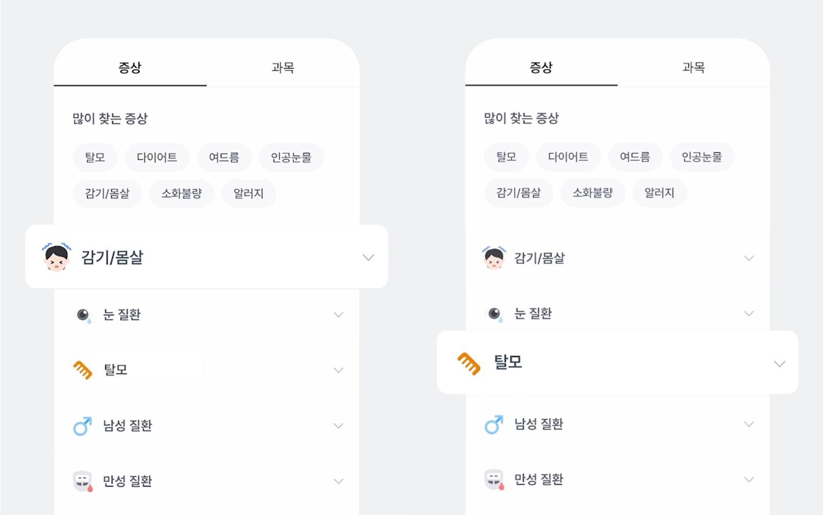 닥터나우 앱 메인 화면에서 비대면 진료 탭을 클릭하고, 감기, 피부염, 탈모 등 원하는 증상이나 진료 과목을 선택합니다.