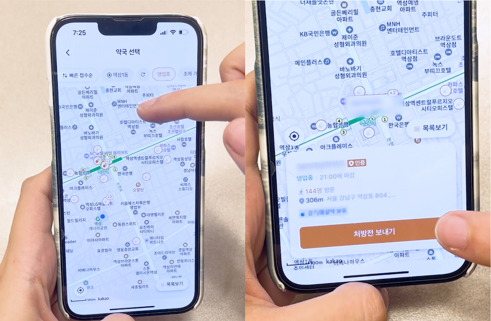 진료가 완료되면 가까운 약국을 선택할 수 있습니다. 필터를 통해 영업 중인 약국이나 인증 약국을 찾을 수 있으며, 지도뷰를 통해 약 재고가 있는 약국도 추천받을 수 있습니다.