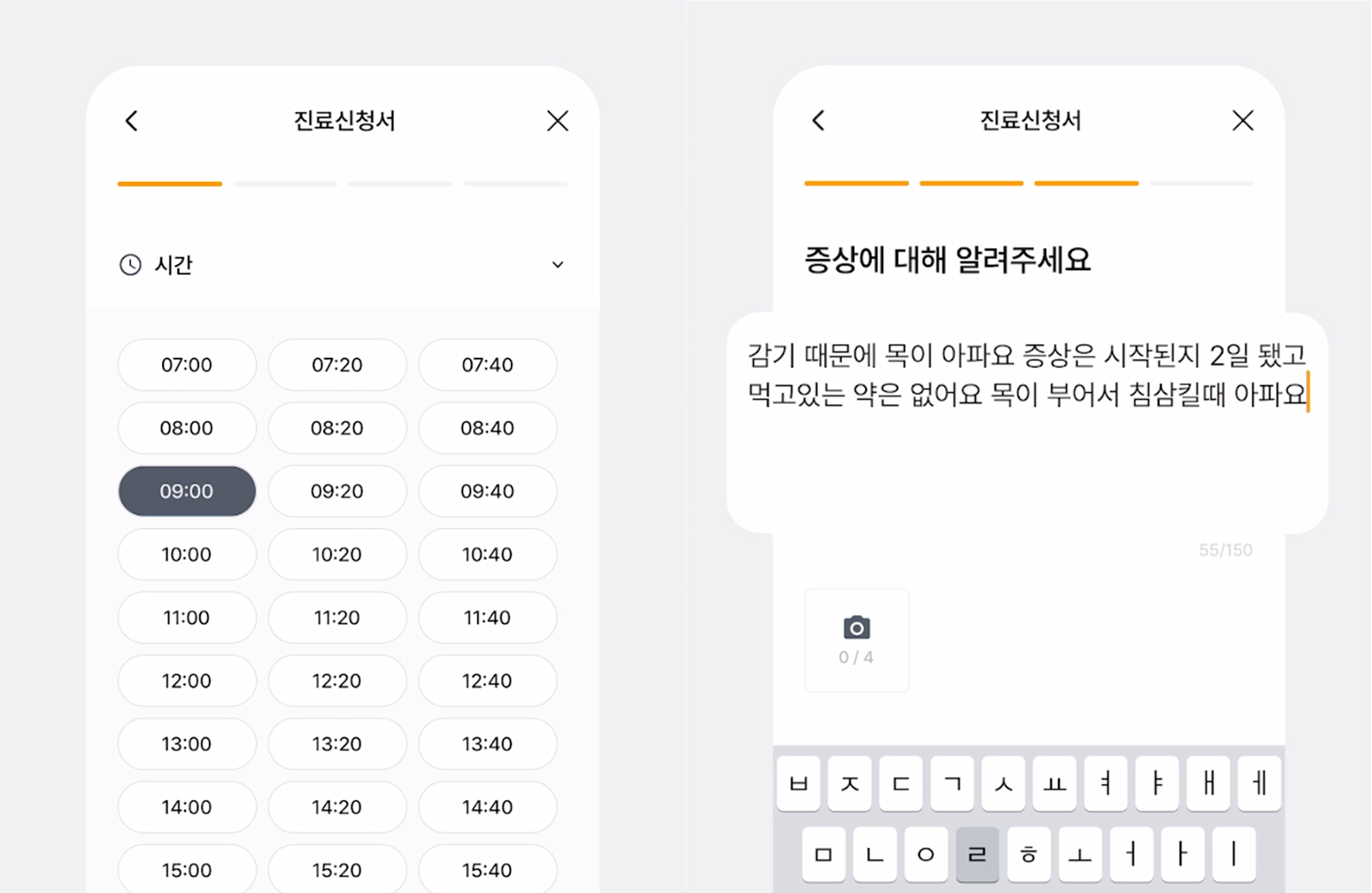 의사를 선택한 후, 원하는 진료 시간을 예약하고 진료 신청서를 작성합니다. 현재 증상과 관련된 내용을 입력하고, 필요 시 사진을 첨부하면 보다 정확한 진료가 가능합니다.