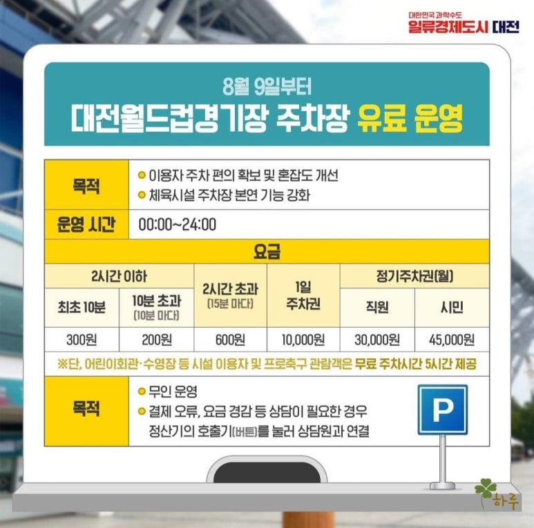 대전월드컵경기장 방문 시 유료 주차가 운영됩니다. 경기 관람 시 5시간 무료 주차가 제공되니 참고하세요.